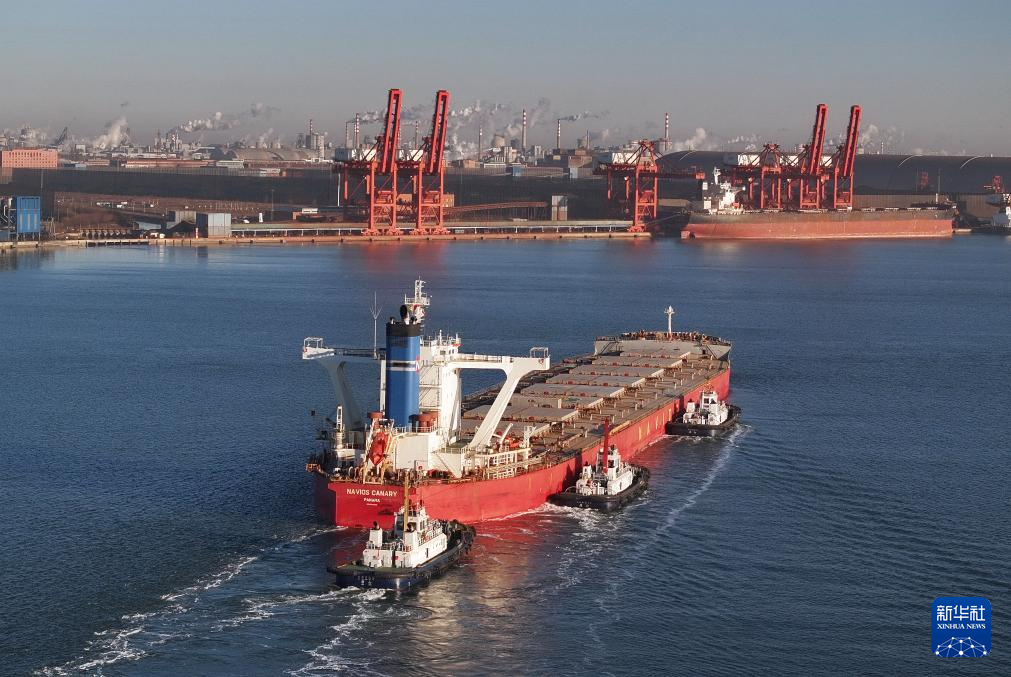 1月15日,一艘轮船靠泊在唐山港京唐港区散货码头卸货(无人机照片)。