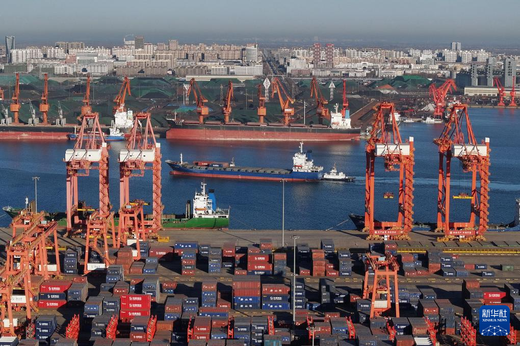 1月15日拍摄的唐山港京唐港区集装箱码头堆场(无人机照片)。