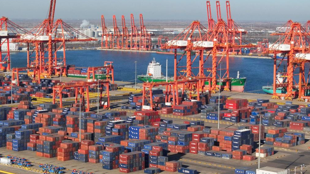 1月15日,工人驾驶车辆在唐山港京唐港区集装箱码头转运集装箱。