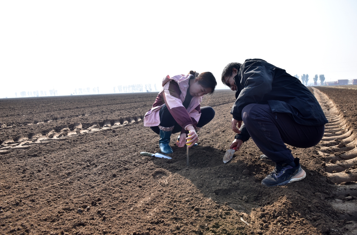 农技人员查看播种质量。邱洪生 摄