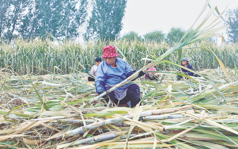 在固安县彭村乡小辛庄村的甘蔗种植地里,农户采收甘蔗。通讯员 陈放 摄