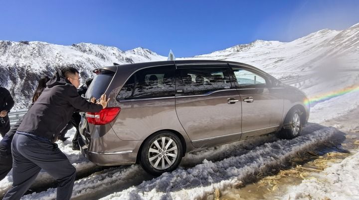 行至垭口一拐弯处,车辆反复打滑溜坡。天黑在即,在当地人帮助下,大家推车前进,因高寒缺氧,推几步就大口喘气,有人用力过猛直接人仰马翻。