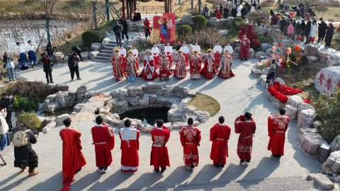 相濡以沫,白首一心,情相结,心相印。鸳鸯泉畔,8对新人身着传统婚服,演绎中式浪漫。1月1日,一场简约、庄重的中式集体婚礼在河北省邢台市百泉鸳水公园举办。