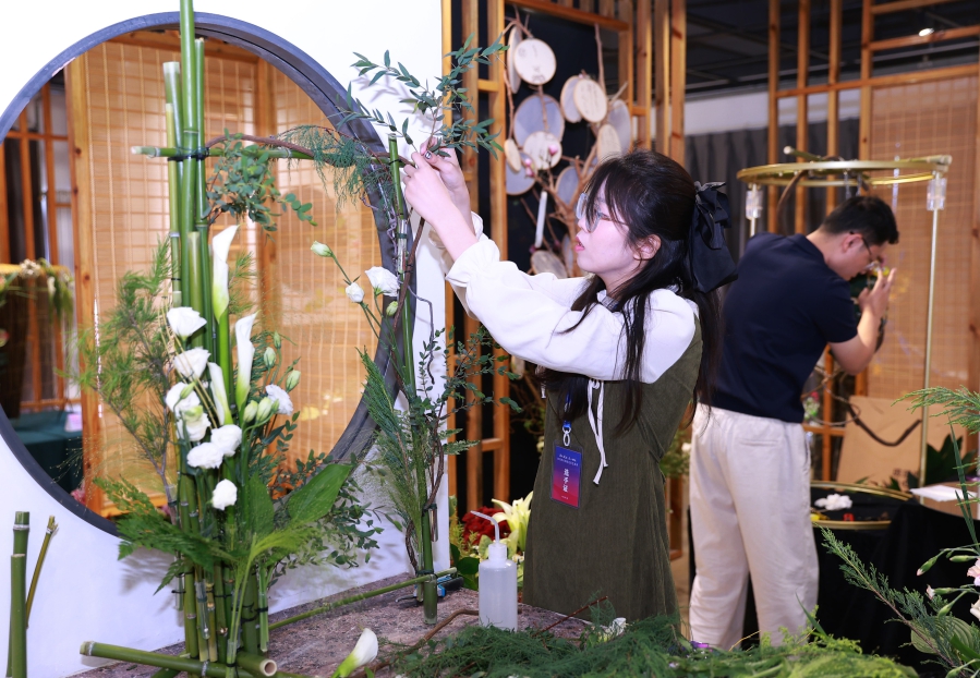 在2025河北省插花花艺展赛上,选手在制作插花作品。