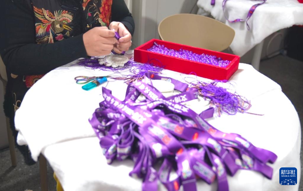 3月13日,绳编艺人在进行奖牌绶带装配。新华社记者 董笑坤 摄