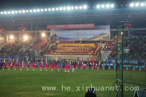| 邯郸太极盛会受“老外”欢迎 | | 10月19日下午,2008驻华使节和夫人中国才艺大赛(太极拳篇)在太极拳之乡邯郸市落下帷幕。来自法国、德国、英国、哥伦比亚等43个国家的150余位大使、参赞及部分大使夫人共同签署“促进太极拳走向世界邯郸宣言”。[详细内容] |  | | 第十一届国际太极拳运动大会在河北邯郸揭幕 | | 金秋十月,河北邯郸迎来中外太极拳爱好者。中国邯郸第十一届国际太极拳运动大会17日在此间揭幕。这次太极拳运动大会得到了海内外太极拳界的广泛响应,到9月15日截止报名时,共有1950名选手报名;其中境内报名1851人,境外99人,涉及韩国、美国、澳大利亚、俄罗斯等14个国家。同时,54个外国驻华使节和夫人也来到邯郸参与中国才艺大赛(太极拳篇)活动,共练太极,游览古城。[详细内容] |  | | 邯郸是太极的圣地 世界是太极的舞台 | | 昨晚,邯郸市体育场灯光璀璨,高朋满座,一派喜气洋洋的景象,备受国内外瞩目的中国邯郸第十一届国际太极拳运动大会开幕式在这里隆重举行,来自近50个国家的驻华使节与夫人,14个国家热爱太极拳的朋友、全国各省(市)自治区的代表队聚首古城,共庆太极盛会,共谱太极新篇章。 [详细内容] |  |